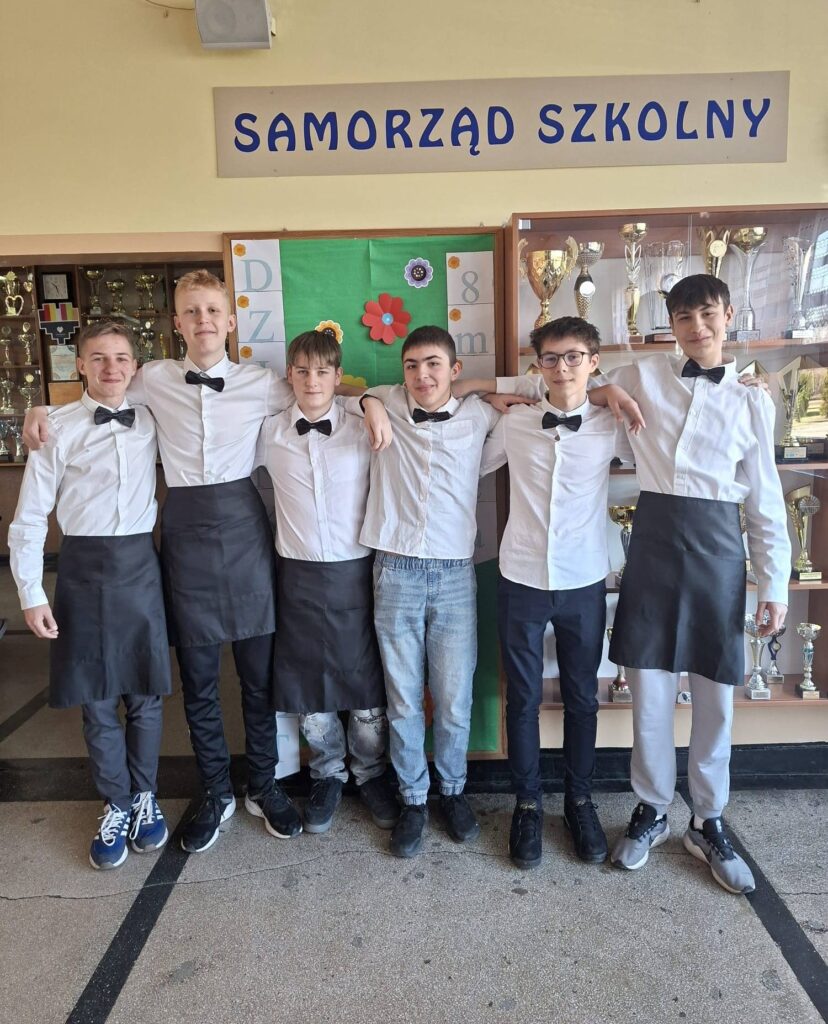 Przystojni kelnerzy z 8b rozdawali dziś niespodzianki dla żeńskiej części spiłeczności uczniowskiej.
