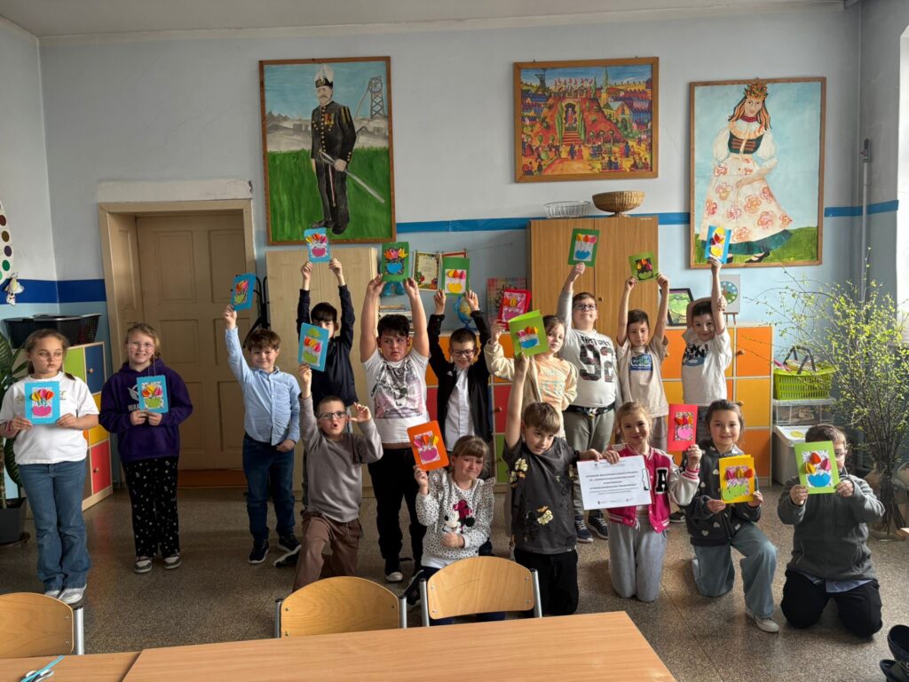 Dzisiaj uczniowie klas 1c, 2a oraz 3a uczestniczyli w warsztatach plastycznych, prowadzonych przez Panie z Centrum Społecznościowego Szopki, pt.,, Scrapbookingowe kartki wiosenno-świąteczne”.