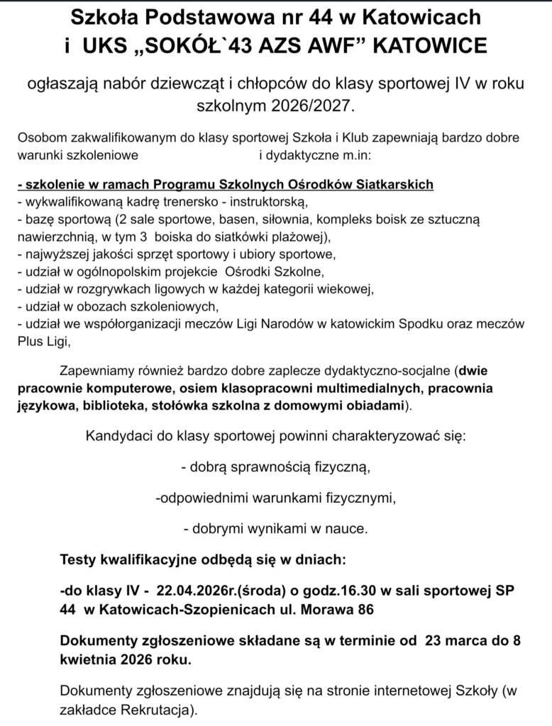Szkoła Podstawowa nr 44 w Katowicach i UKS „SOKÓŁ`43 AZS AWF” KATOWICE ogłaszają nabór dziewcząt i chłopców do klasy sportowej IV w roku szkolnym 2026/2027. Zapraszamy do zapoznania się ze szczegółami naboru oraz do pobrania wniosku zgłoszeniowego. Znajdziecie tutaj Państwo również krótką prezentację szkoły.